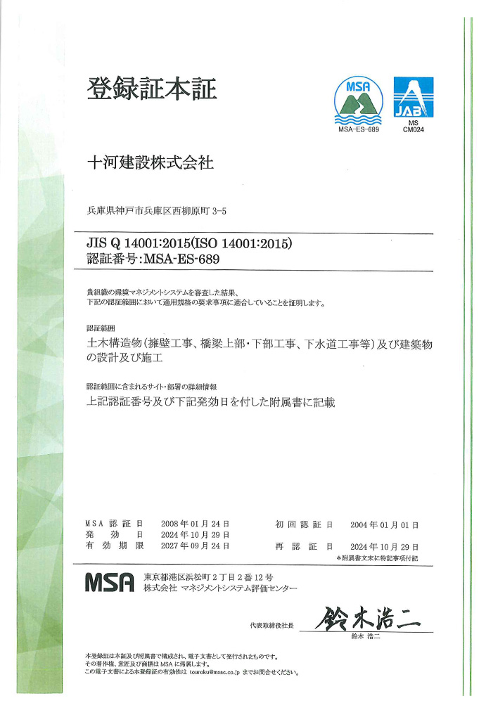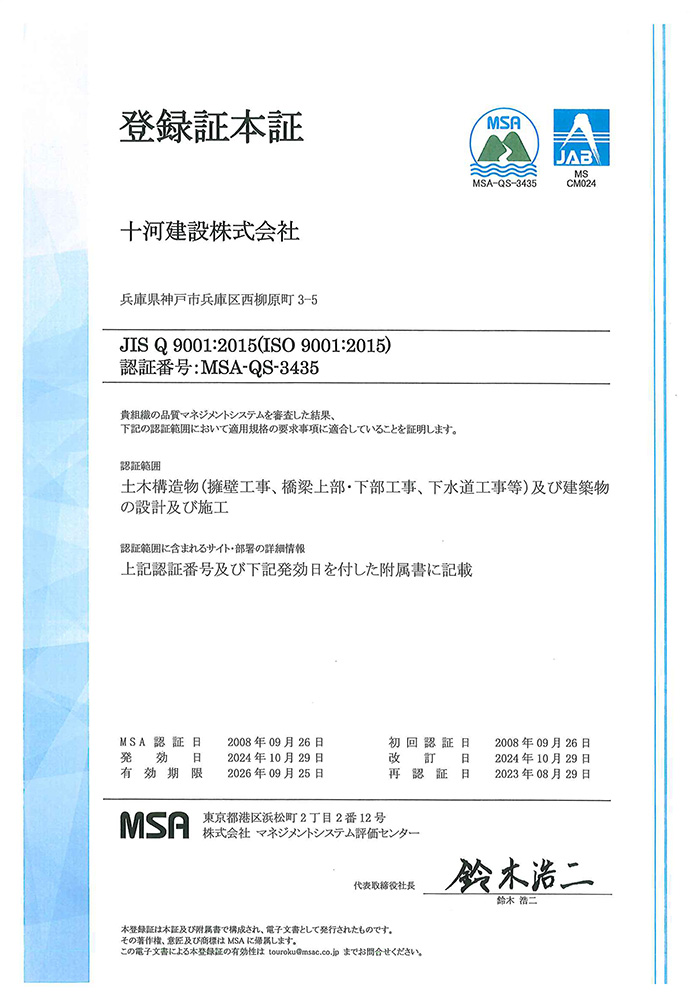 十河建設株式会社では品質マネジメントシステムの国際規格「ISO9001」および