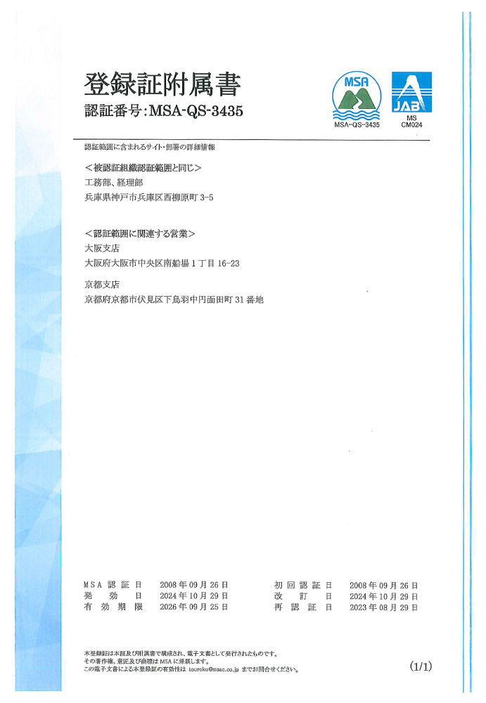 大臣(特-3)第20471号 (土木工事業、建設工事業、大工工事業、とび・土工工事業、石工事業、鋼構造物工事業、鉄筋工事業、ほ装工事業、しゅんせつ工事業、塗装工事業、水道施設工事業、解体工事業) |